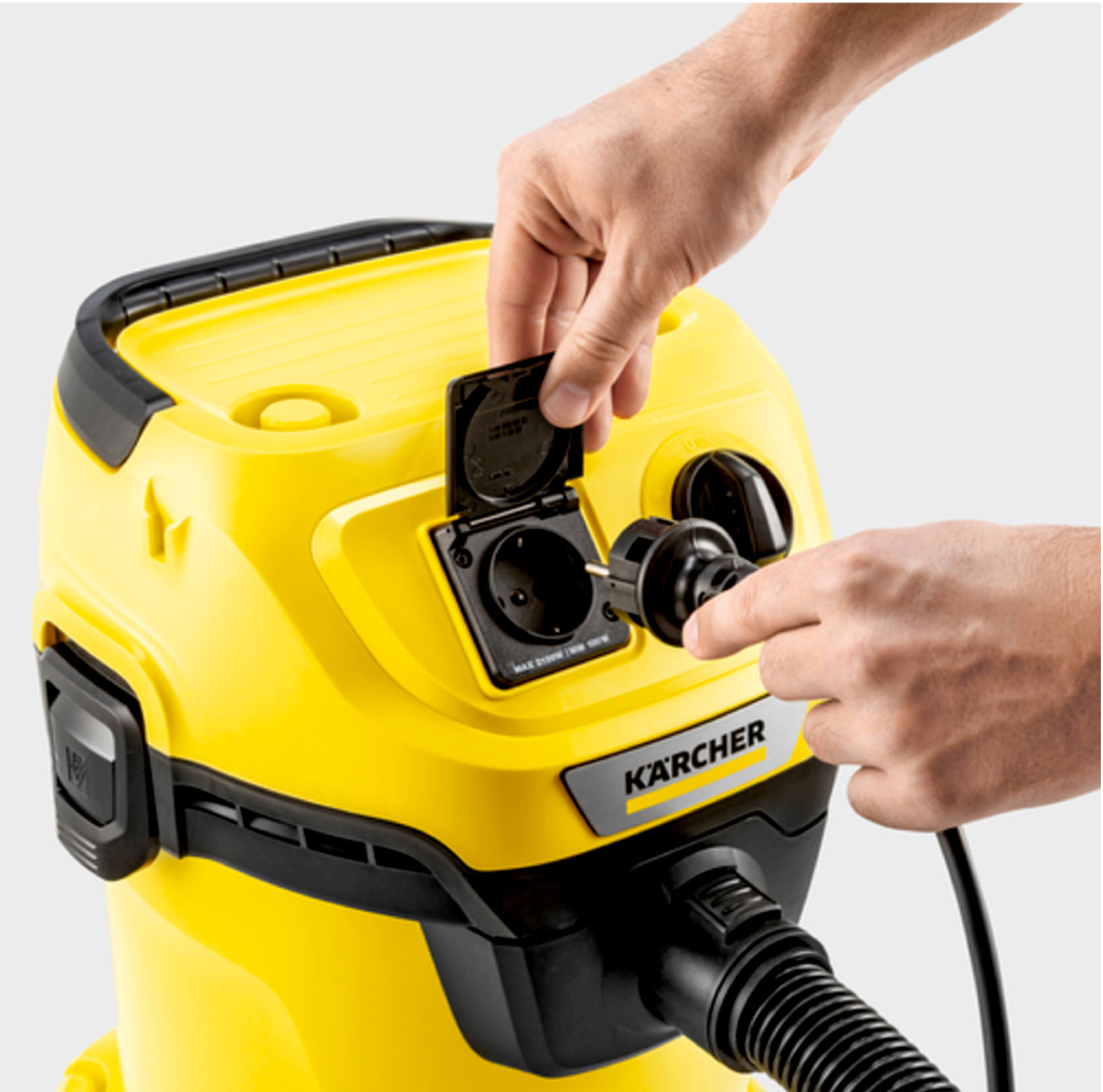 Le WD 3 P V‑19/4/20 aspire poussières, gravats et petites quantités d’eau, et convient aux petits travaux d’atelier grâce à sa prise d’asservissement.